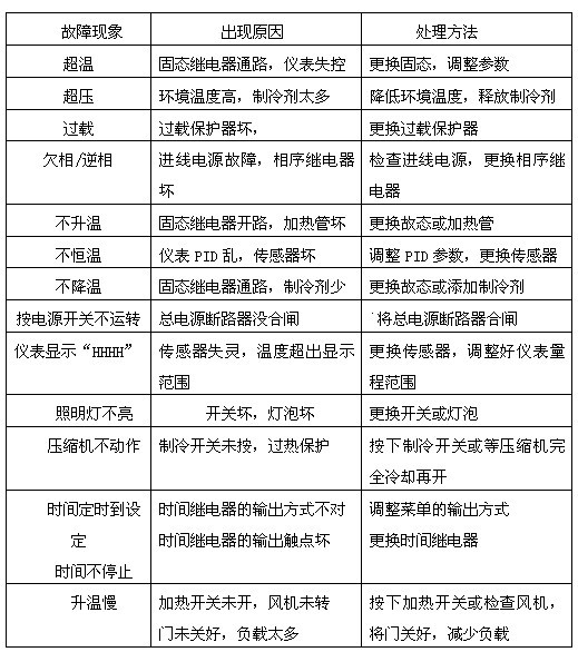請參照表列方式,來排除貴公司可程式恒溫恒濕試驗箱故障。如果你的故障在下列表中,沒有描述,而你未能排降時,請速與本公司維修部門聯絡。技術支持:024-83503936